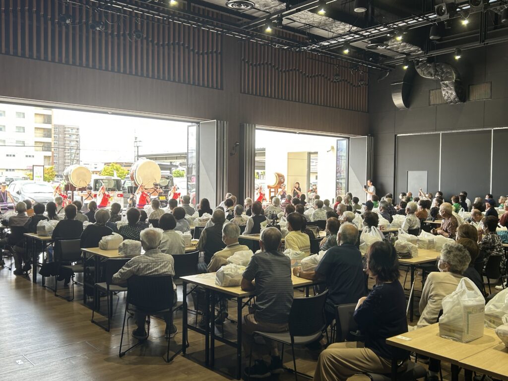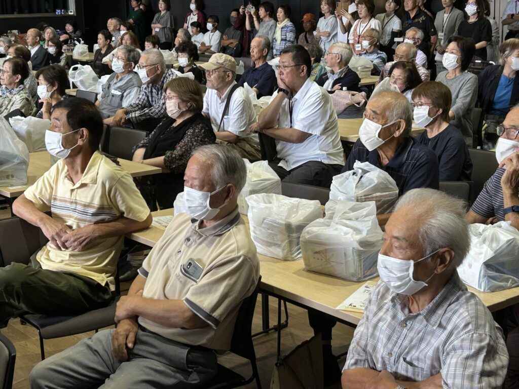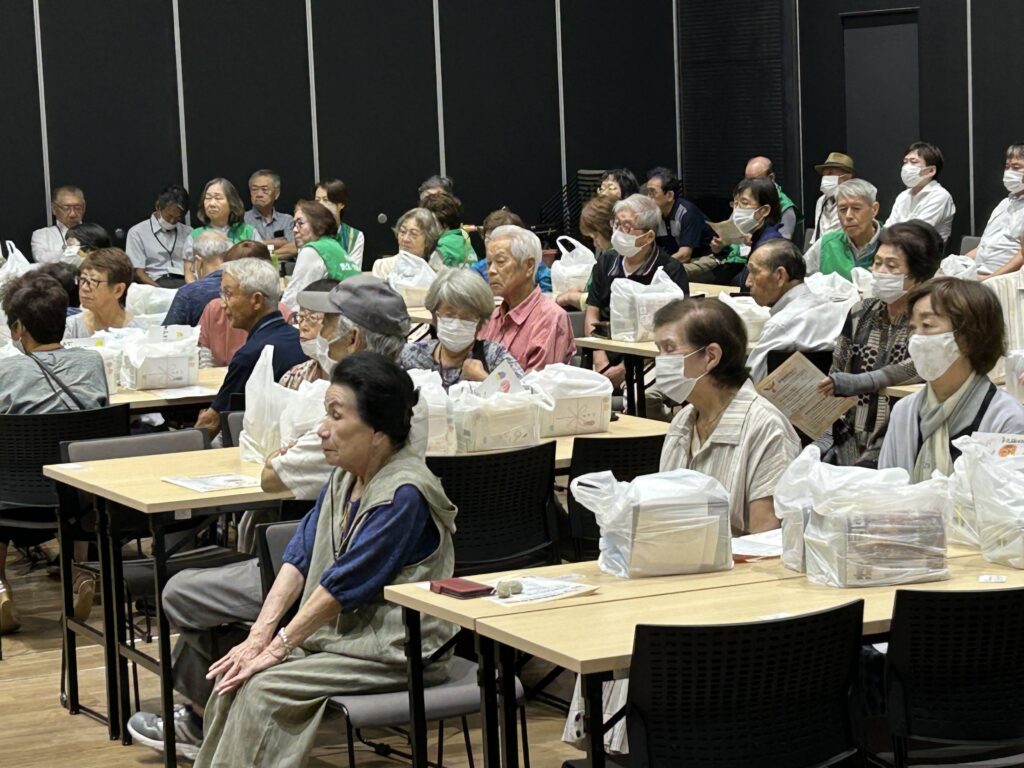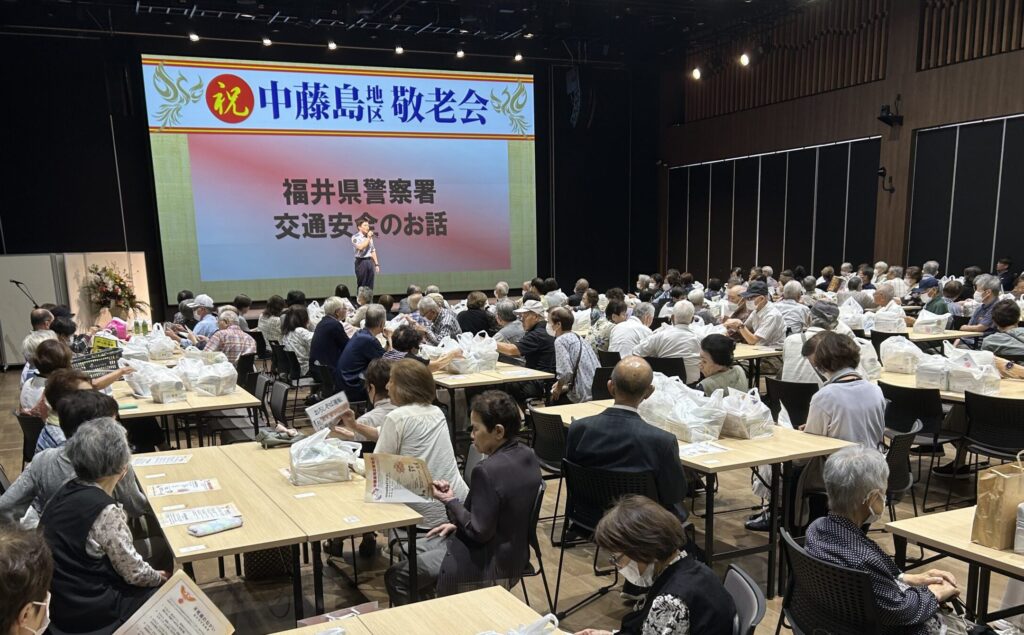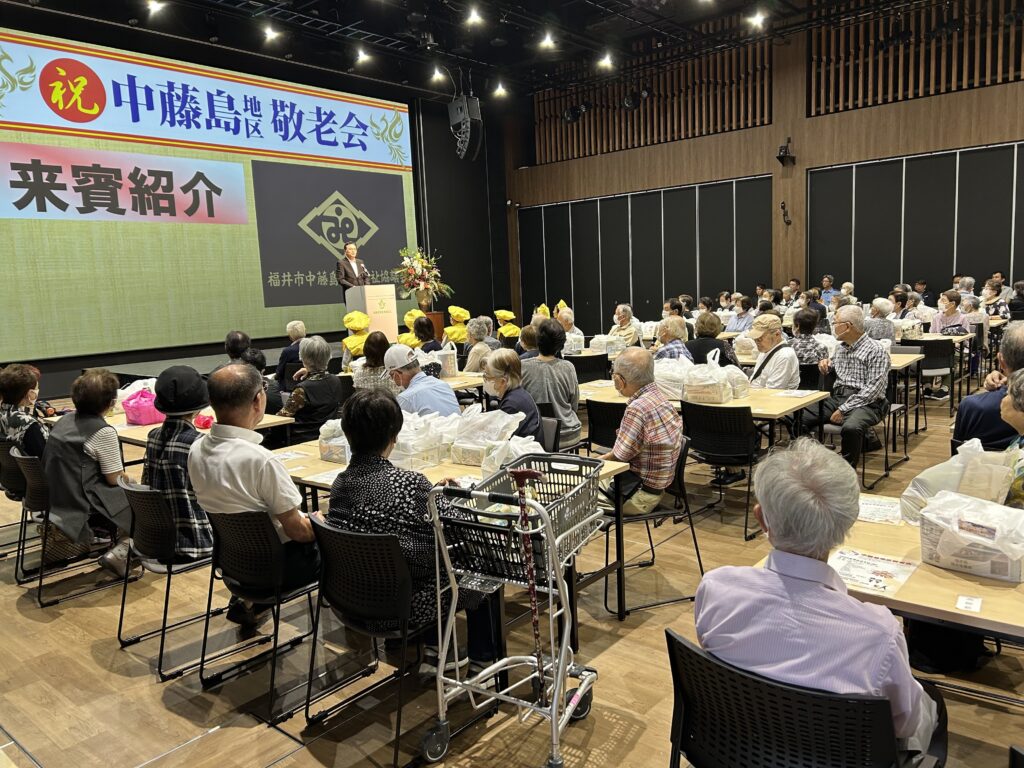 中藤島地区の敬老会を開催。地区の関係者がホールに集まり、地域のお年寄りの長寿を祝いました。