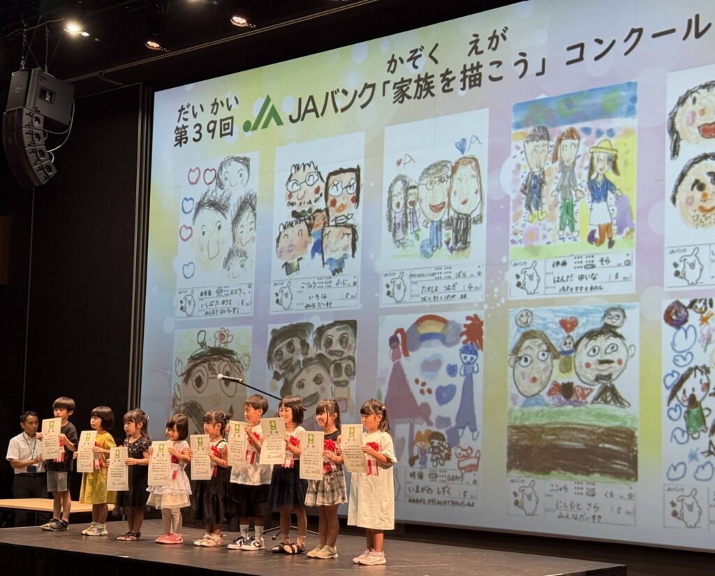 家族を描こうコンクール表彰式 JAバンクが主催する「家族を描こうコンクール」の表彰式が行われました。400インチの巨大スクリーンには各賞の作品が投影され、受賞者のみなさんは自分の作品を前に記念撮影をする姿も。【表彰式の様子】【作品をパネル展示:ホール入り口】 400インチスクリーン 小ステージ 音響・照明 その他(机・椅子・控室など)