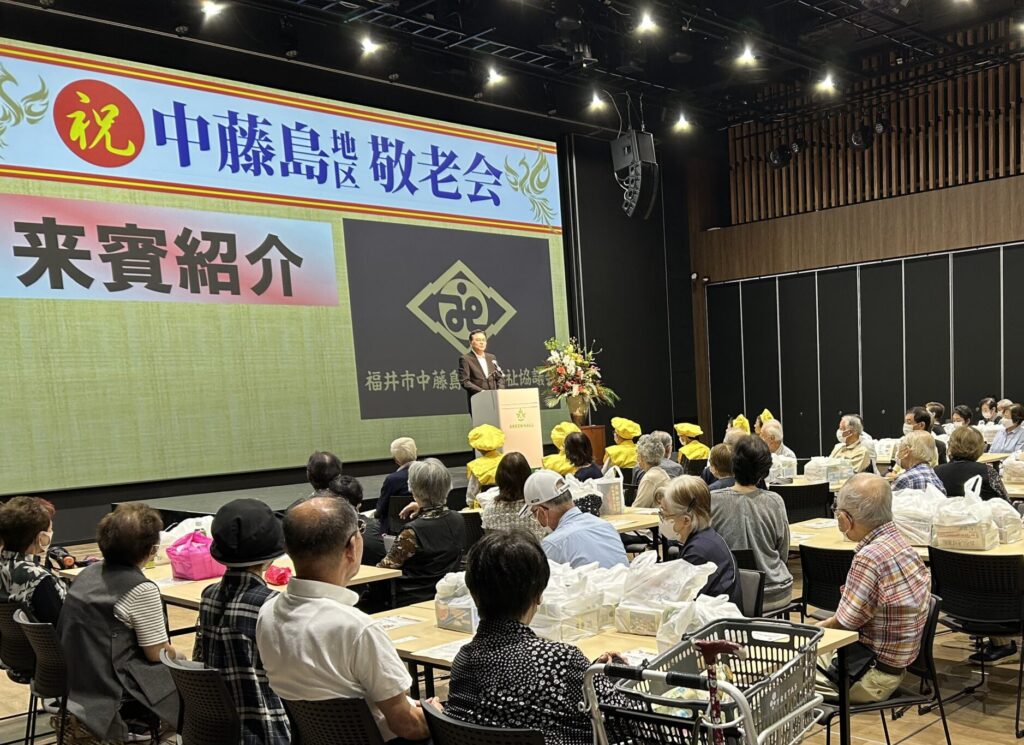 中藤島地区敬老会 中藤島地区の敬老会を開催。地区の関係者がホールに集まり、地域のお年寄りの長寿を祝いました。【中藤島地区敬老会:交通安全の話】【駐車場側ガラスウォールを開放】 400インチスクリーン 小ステージ 音響・照明 その他(テラス・机・椅子)