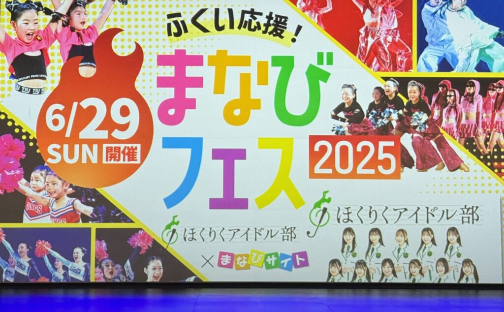 ふくい応援!まなびフェス2025 福井・石川・富山で様々な習い事を展開する「まなびサイト」が同じく北陸3県を中心に活動する「ほくりくアイドル部」とコラボしたフェスを開催。子どもから大人まで大勢の家族連れで賑わいました。【まなびフェス2025】ほくりくアイドル部のステージ 400インチスクリーン 大ステージ 音響・照明 その他(机・イス・控室など)